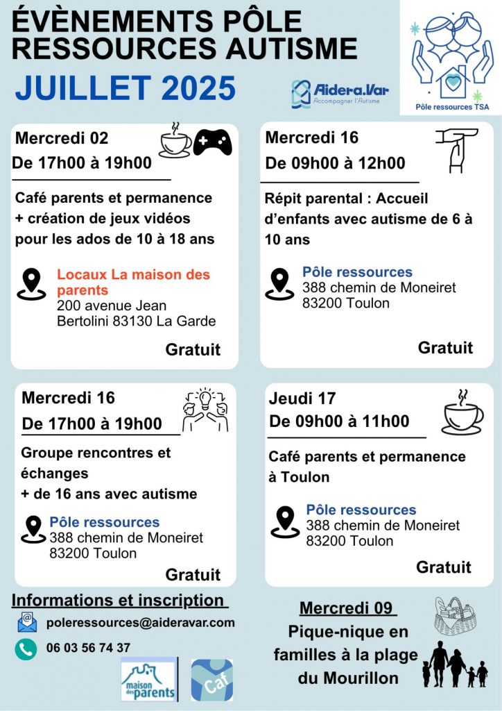 Nous vous présentons le planning du pôle ressources Aidera Var pour le mois de juillet Café des parents à La Maison des Parents à La Garde et atelier création de jeux vidéos de 10 à 18 ans Pique-nique en famille à la plage du Mourillon à Toulon Répit parental avec […]
